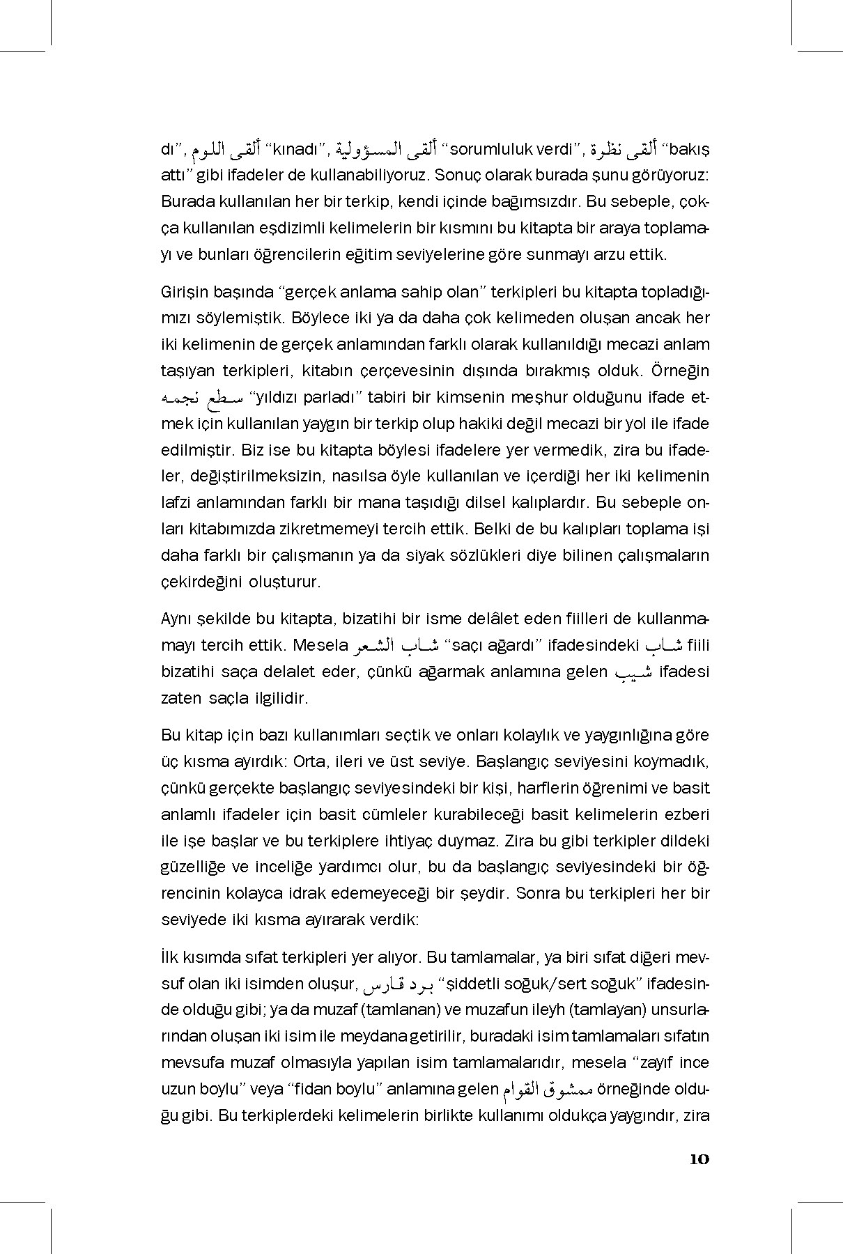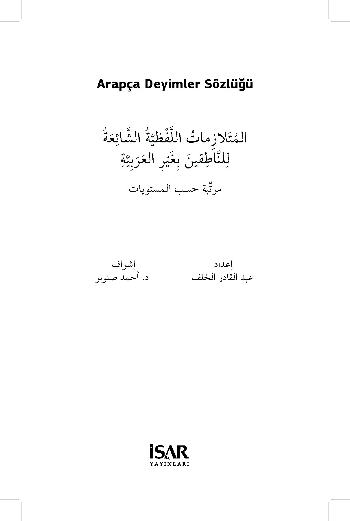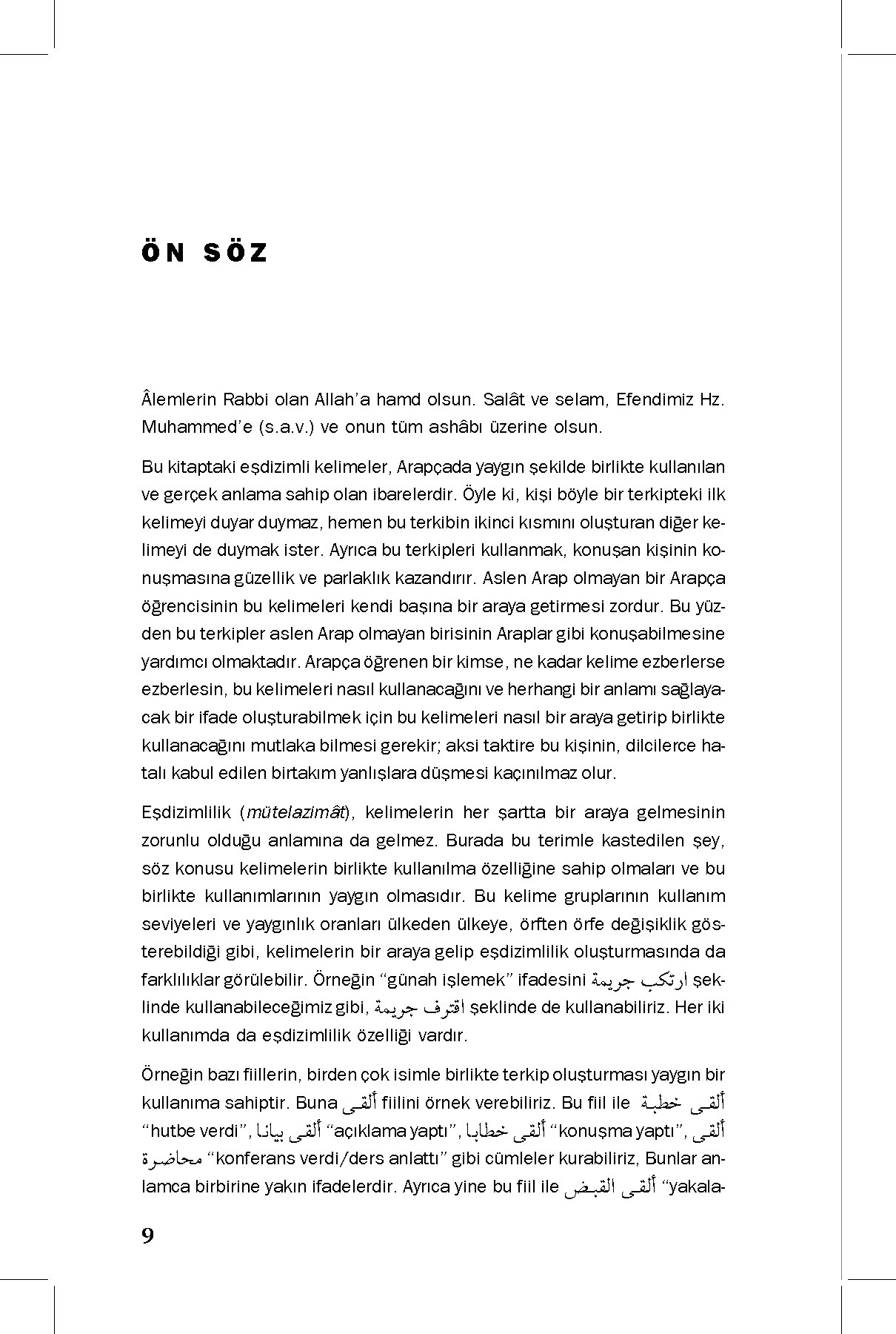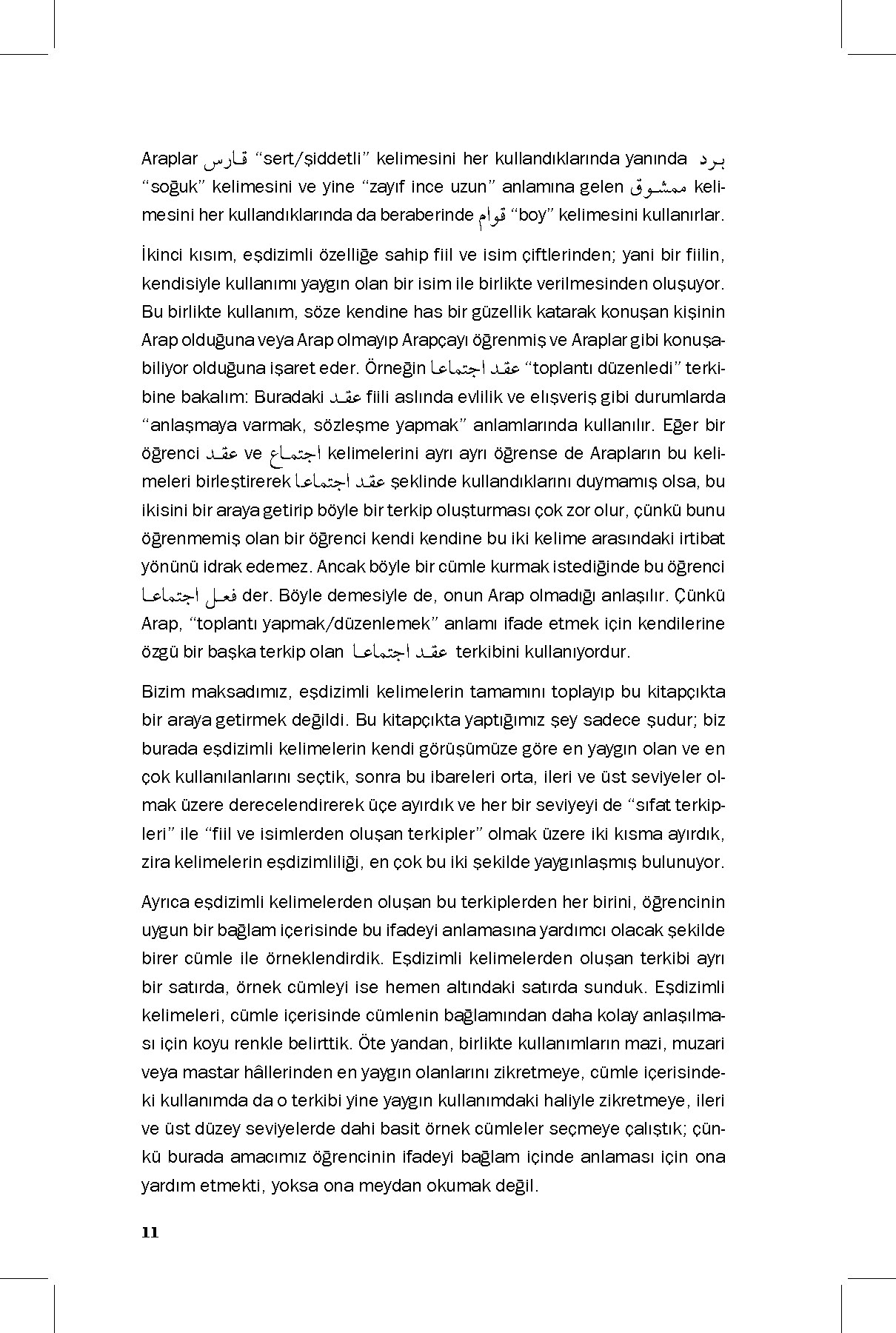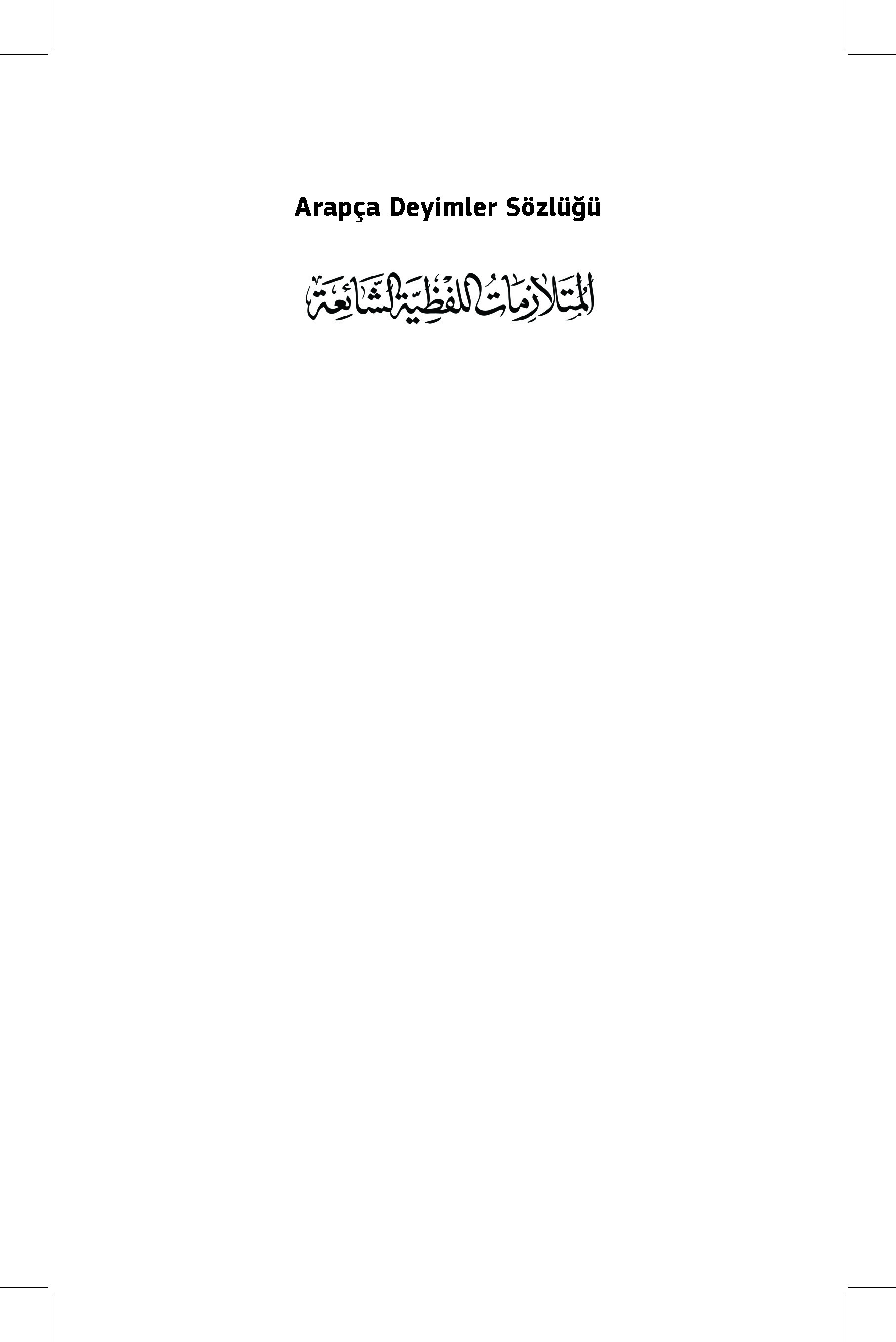 Elinizdeki kitap, bu yönüyle son derece zengin bir dil olan Arapçada yaygın olarak bir arada kullanılan, gerçek anlamlı kalıplaşmış söz gruplarını derleme amacıyla hazırlanmıştır. Arapça eğitimi alan öğrencileri merkeze alarak düzenlenen bu sözlük, eşdizimli kelimeleri Türkçe karşılıkları ve örnek cümleler eşliğinde gösteren pedagojik bir çalışmanın ürünü olarak ilgililerin istifadesine sunulmuştur.