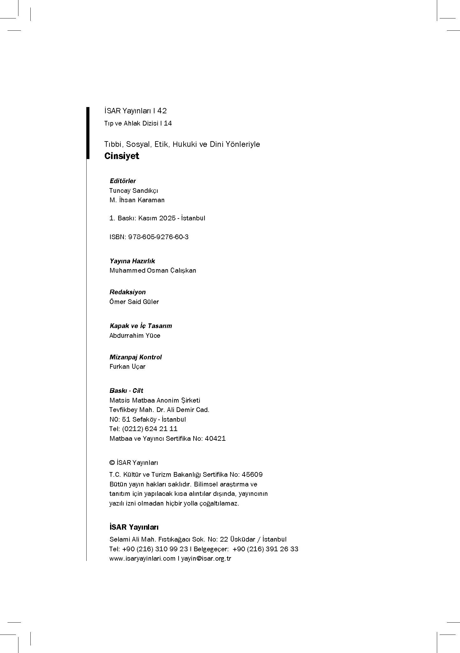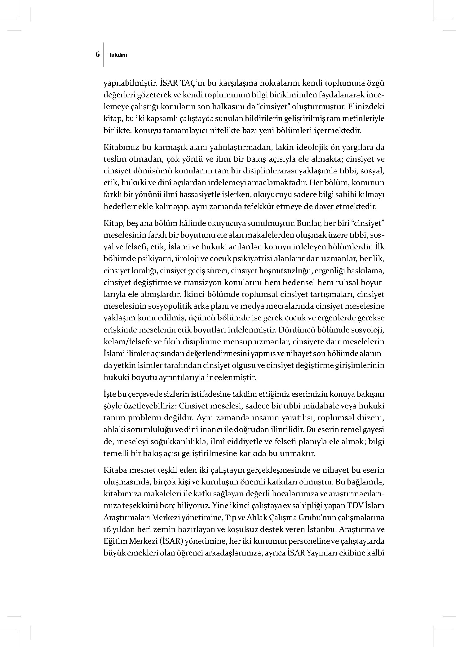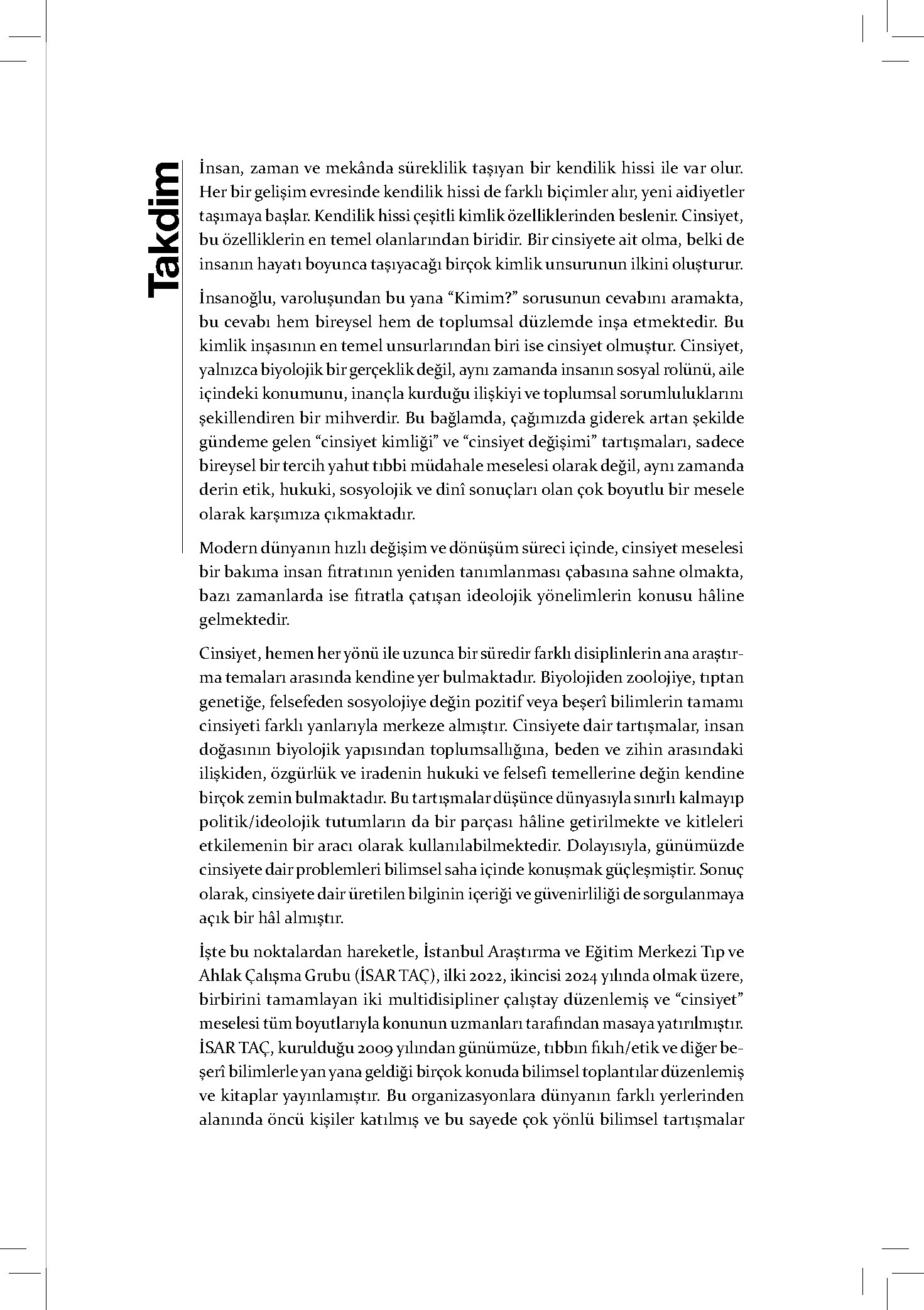 Elinizdeki kitap, cinsiyet meselelerine dair tıbbın ne söyleyip ne söylemediğini, hâlihazırdaki metodolojisi içinde söyleyebileceklerinin sınırlarını, beşerî yönünün de hakkını verir biçimde sadece tıbbi açıdan değil, sosyal, etik, dinî ve hukuki açılardan incelemektedir. İSAR Tıp ve Ahlak Çalışma Grubu’nun 14’üncü eseri olan bu kitapta cinsiyetin mahiyeti, sosyopolitiği, güncel tanımlamalar, cinsiyet hoşnutsuzluğu, cinsiyet değiştirme gibi bu alandaki birçok kritik mesele çeşitli disiplinlerden uzman isimlerin katkılarıyla ele alınmaktadır.