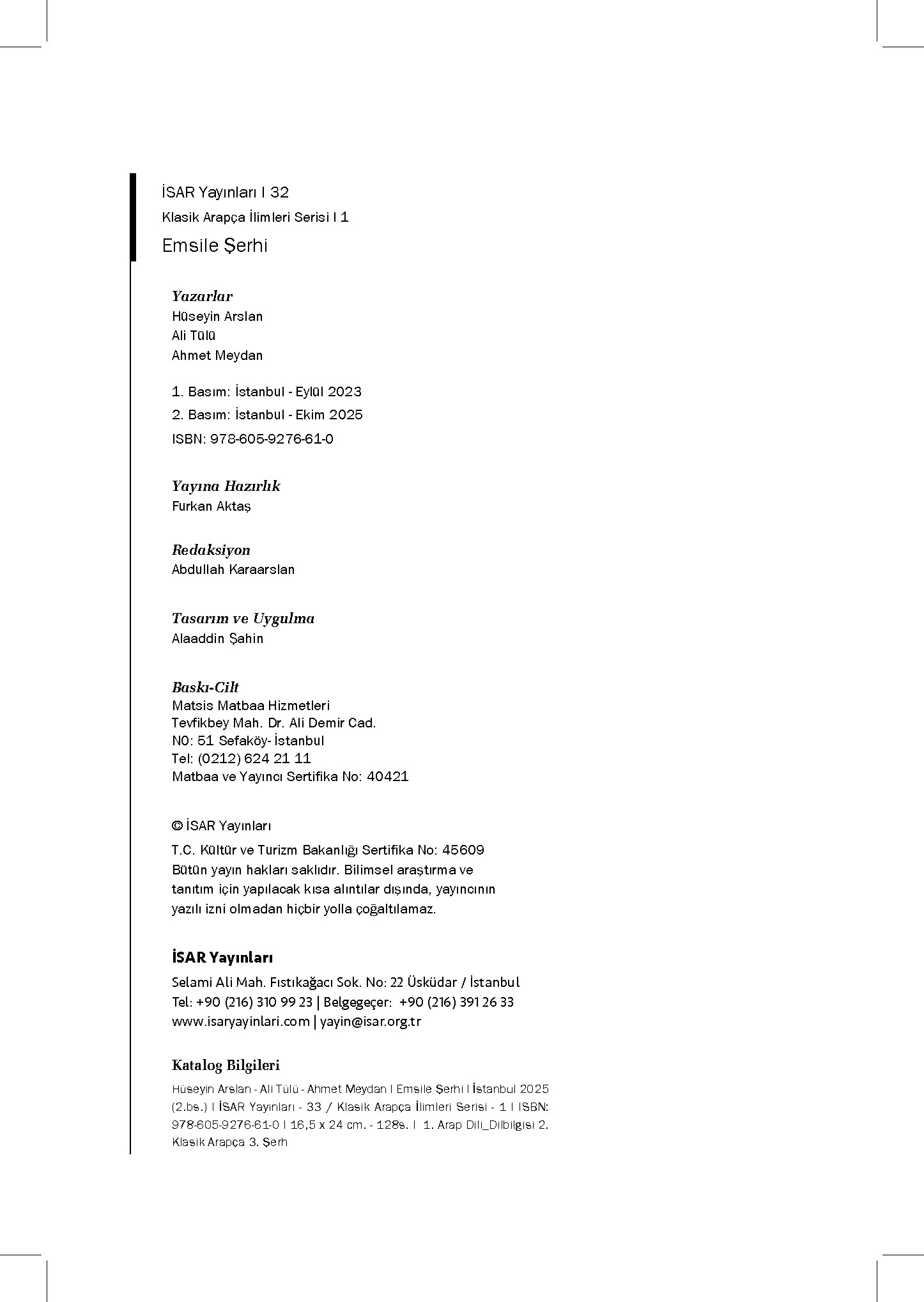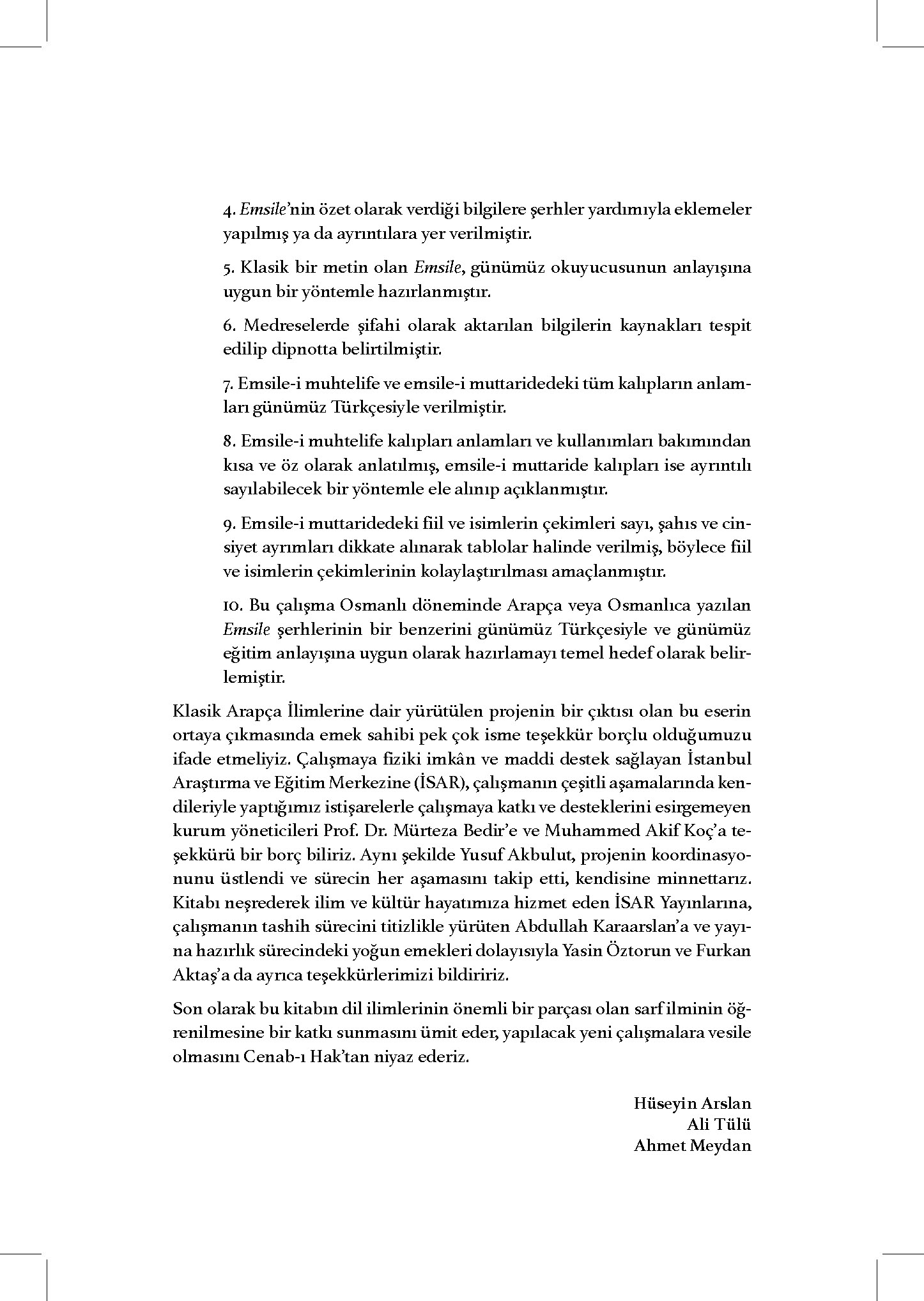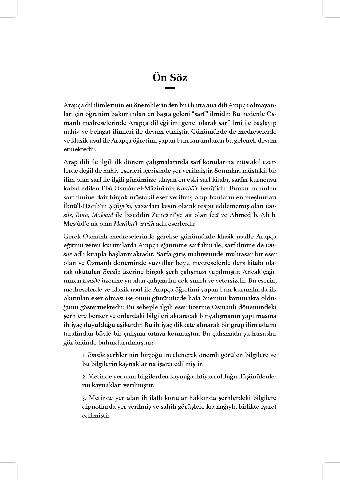 410 ₺ 225 ₺Gerek Osmanlı medreselerinde gerekse günümüzde klasik usulle Arapça eğitimi veren kurumlarda Arapça eğitimine sarf ilmi ile, sarf ilmine de Emsile kitabıyla başlanmaktadır. Sarfa giriş mahiyetinde muhtasar bir eser olan Emsile üzerine birçok şerh çalışması yapılmıştır. Ancak çağımızda Emsile üzerine yapılan çalışmalar çok sınırlı ve yetersizdir. Bu eserin, medreselerde ve klasik usul ile Arapça öğretimi yapan bazı kurumlarda ilk okutulan eser olması ise onun günümüzde hala önemini koruduğunu göstermektedir. Bu sebeple ilgili eser üzerine Osmanlı dönemindeki şerhlere benzer ve onlardaki bilgileri aktaracak bir çalışmanın yapılmasına ihtiyaç duyulduğu aşikardır. Bu ihtiyaç dikkate alınarak bir grup ilim adamı tarafından ilmi/akademik bir çalışma başlatılmıştır. Bu çalışmanın ürünü olarak ortaya çıkan bu eser Osmanlı döneminde Arapça veya Osmanlıca yazılan Emsile şerhlerinin bir benzerini günümüz Türkçesiyle ve günümüz eğitim anlayışına uygun olarak hazırlamayı temel hedef olarak belirlemiştir.