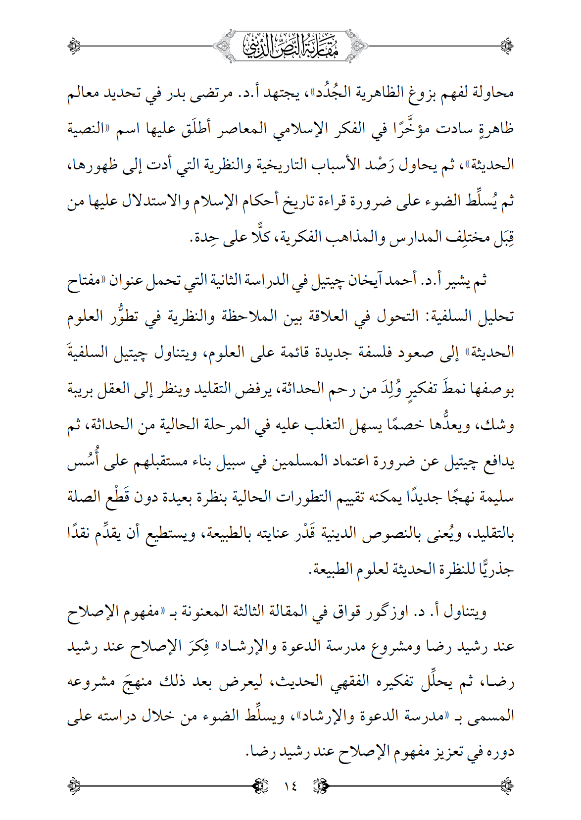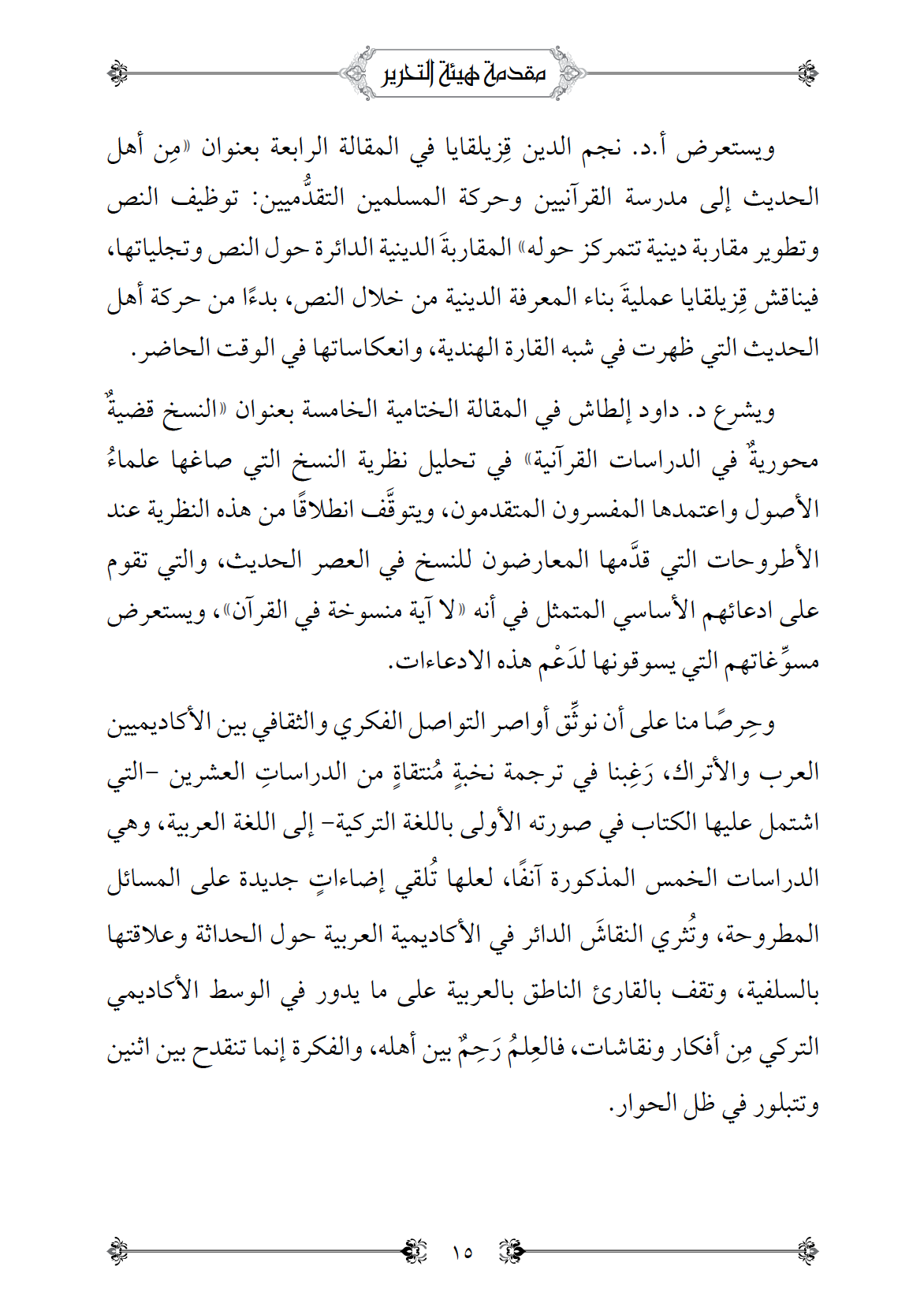 المقاربات التقليدية والمعاصرة فـي تناولها لزوايا من تراثنا العلمي. ويُعدّ مساهمة علمية واعدة تحاول عقد حوار ثقافي بين ضفتيْ الفكر الإسلامي (العربي ـ التركي)، في زمن أحوج ما نكون فيه إلى التكامل لا القطيعة، وإلى العمق لا السطحية