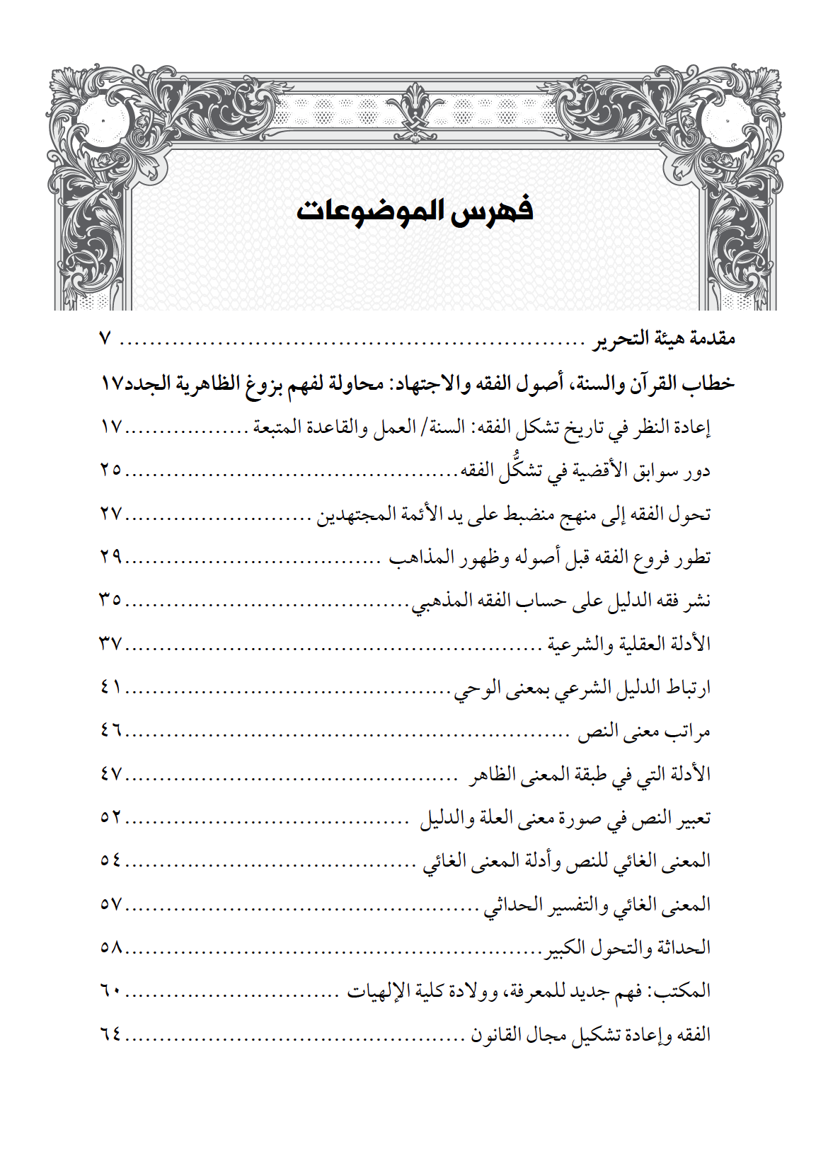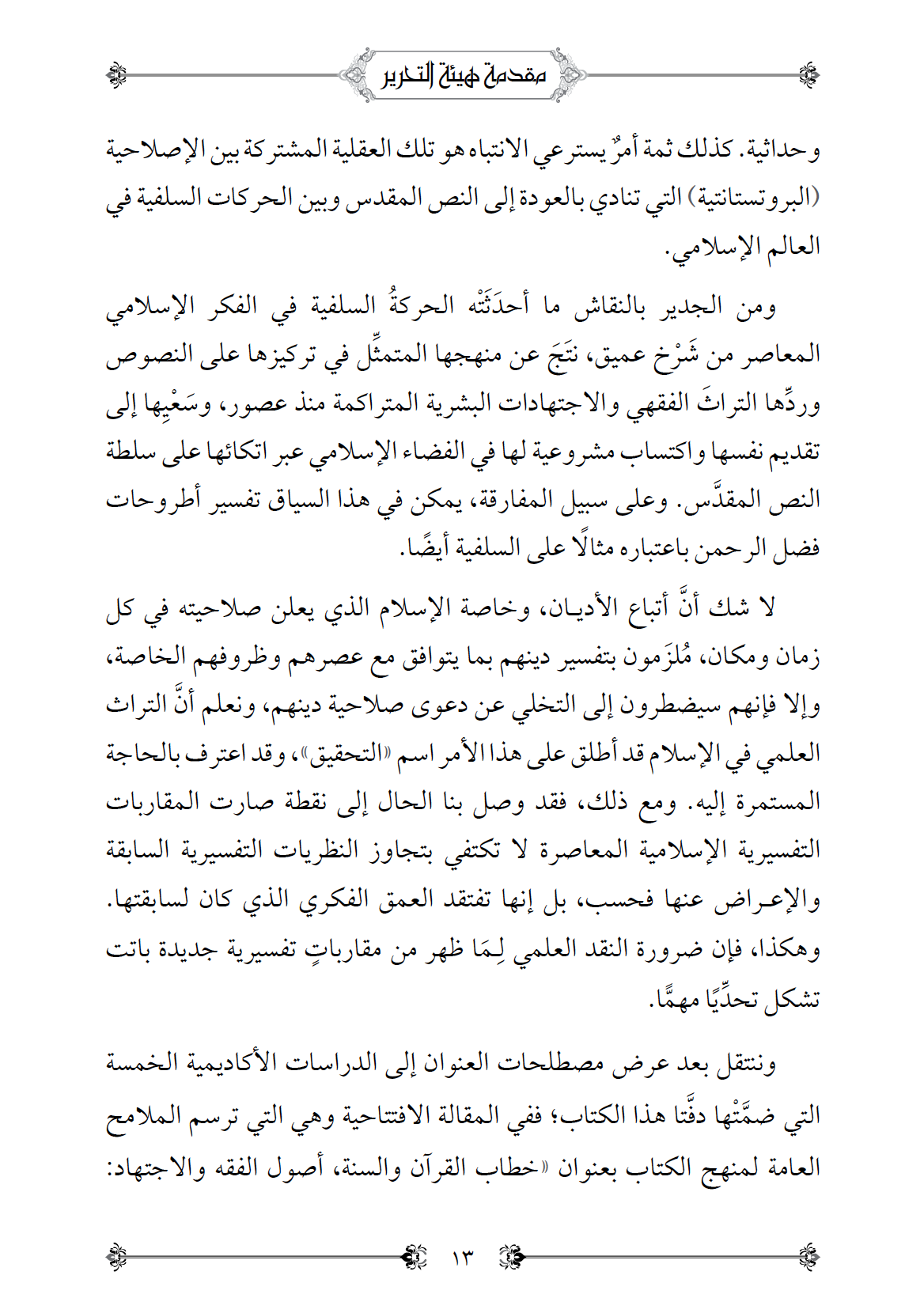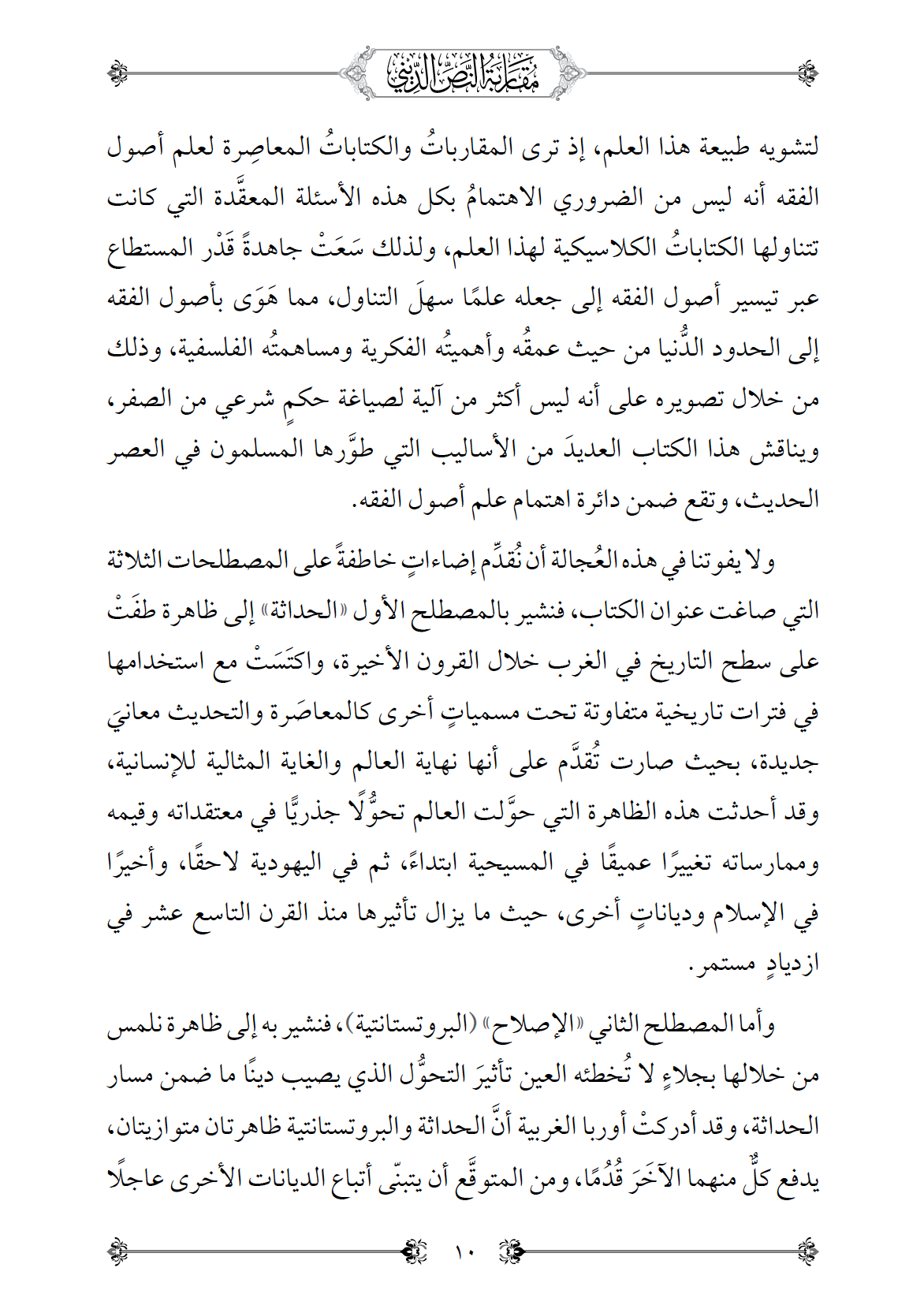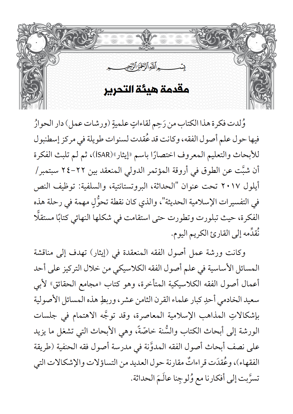 Bu kitap, Arap okurlara Türk akademik çalışmalarının dünyasına açılan benzersiz bir pencere sunmaktadır. Çağdaş dönemde İslam düşüncesindeki dönüşümleri inceleyen ve modernite, protestanlık, selefilik hakkındaki beş nitelikli ilmî çalışma bu eserde bir araya getirilmiştir. Eserin ilk nüvesi, İstanbul Araştırma ve Eğitim Merkezi(İSAR)’ın usûl-i fıkıh ilminin önemine dair düzenlediği ilmî buluşmalarda filizlenmiş, ardından İslam mirasına yönelik çağdaş selefî ve ıslah ekollerinin yaklaşımlarını ele alan uluslararası bir konferansın müzakerelerinde olgunlaşmış, nihayet Arapçaya tercüme edilerek el-Ğânim Yayınevi’nin takdire şayan gayretiyle yayımlanmak suretiyle yolculuğunu tamamlamıştır.