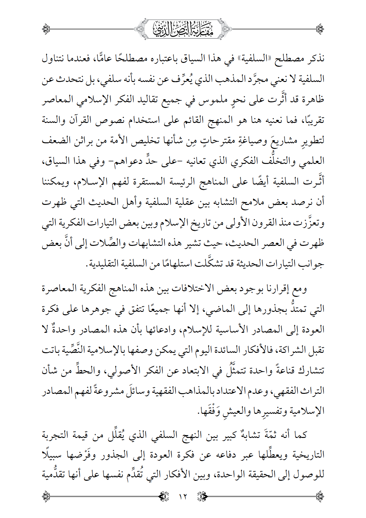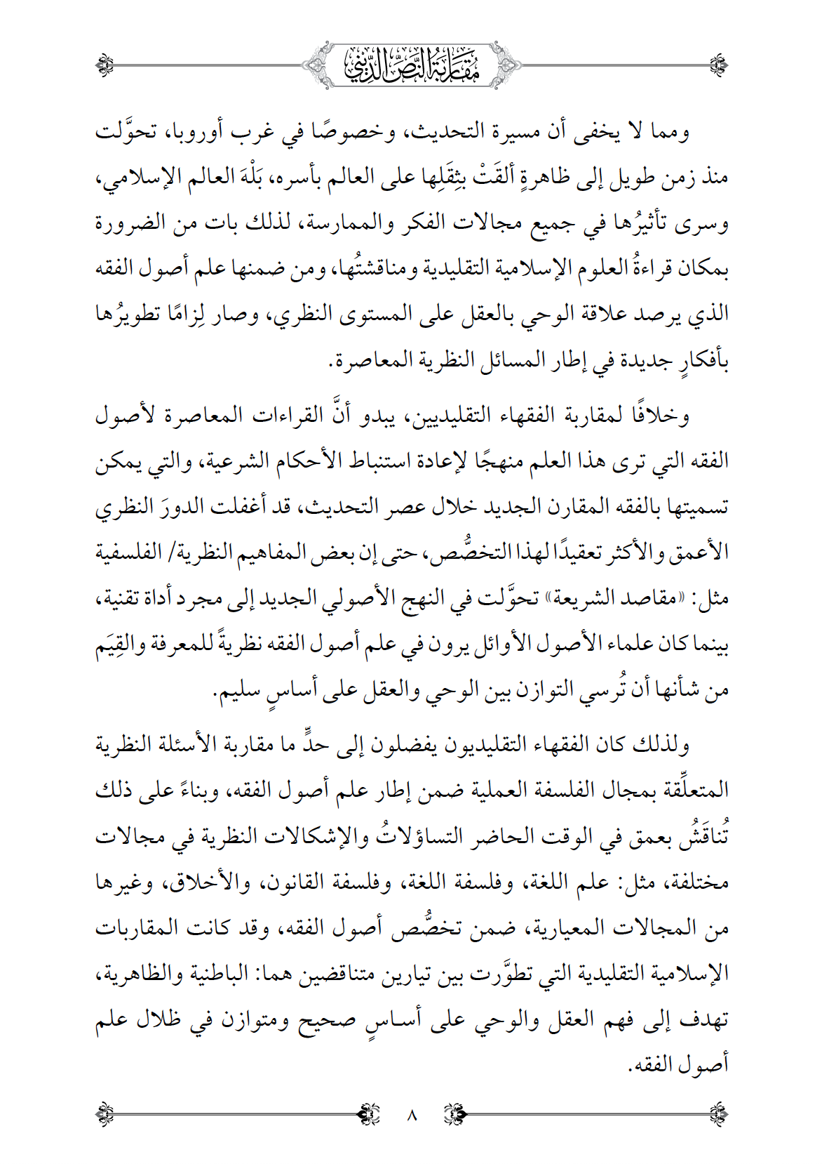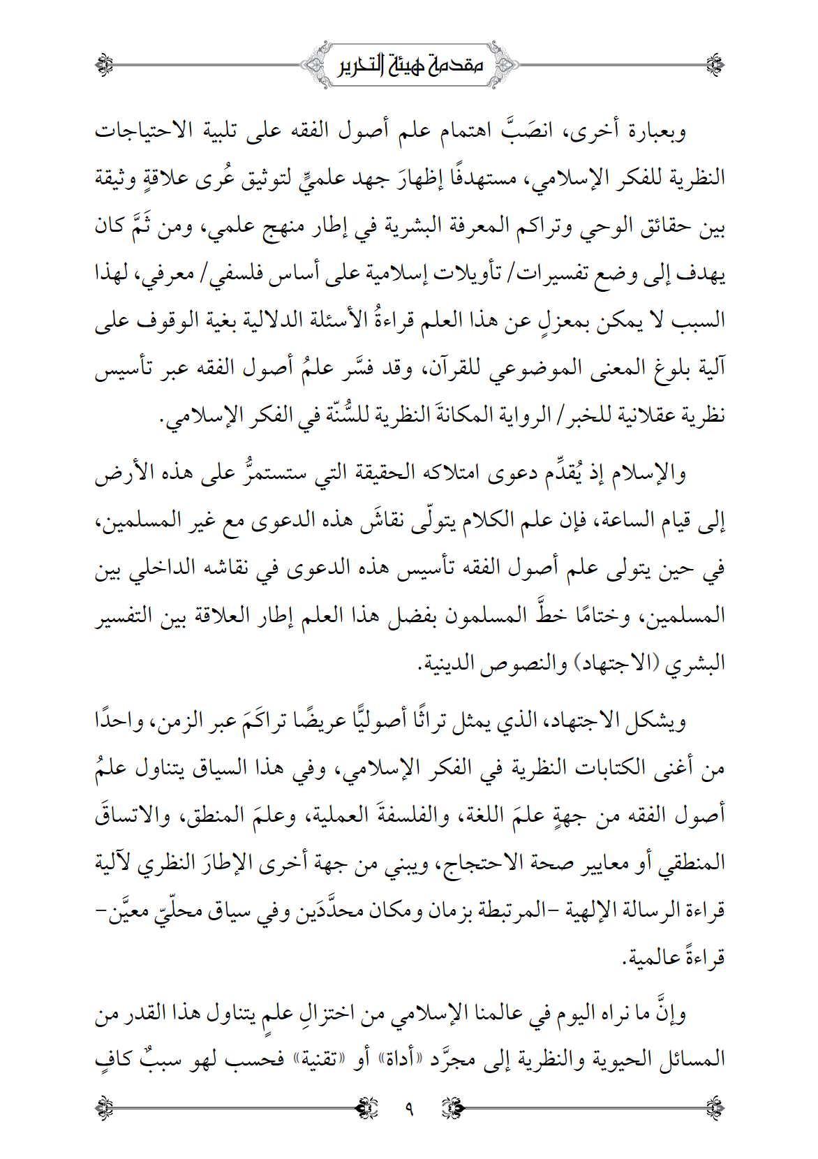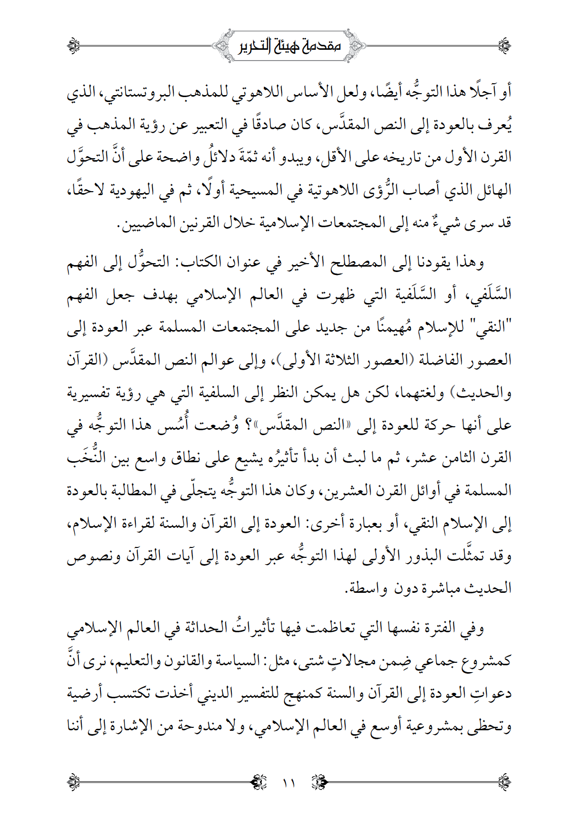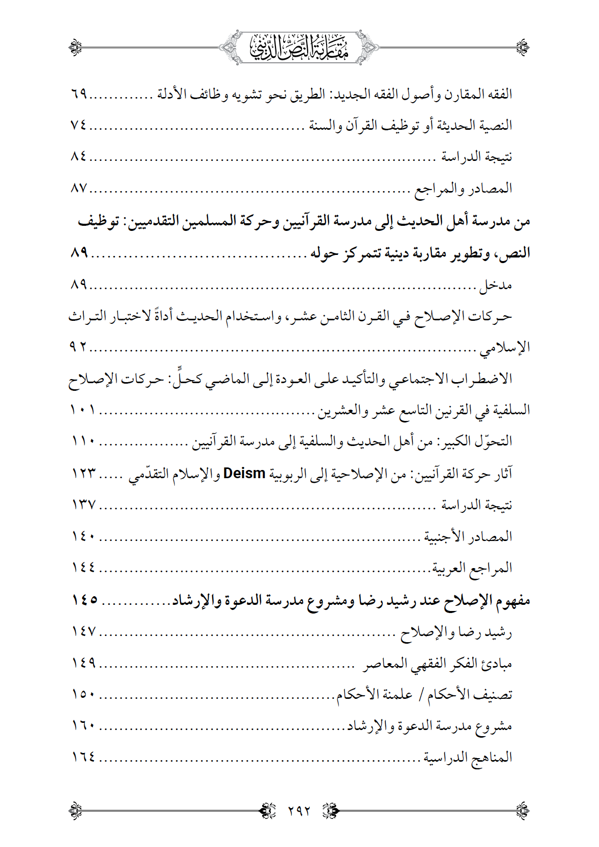 Bu kitap, Arap okurlara Türk akademik çalışmalarının dünyasına açılan benzersiz bir pencere sunmaktadır. Çağdaş dönemde İslam düşüncesindeki dönüşümleri inceleyen ve modernite, protestanlık, selefilik hakkındaki beş nitelikli ilmî çalışma bu eserde bir araya getirilmiştir. Eserin ilk nüvesi, İstanbul Araştırma ve Eğitim Merkezi(İSAR)’ın usûl-i fıkıh ilminin önemine dair düzenlediği ilmî buluşmalarda filizlenmiş, ardından İslam mirasına yönelik çağdaş selefî ve ıslah ekollerinin yaklaşımlarını ele alan uluslararası bir konferansın müzakerelerinde olgunlaşmış, nihayet Arapçaya tercüme edilerek el-Ğânim Yayınevi’nin takdire şayan gayretiyle yayımlanmak suretiyle yolculuğunu tamamlamıştır.