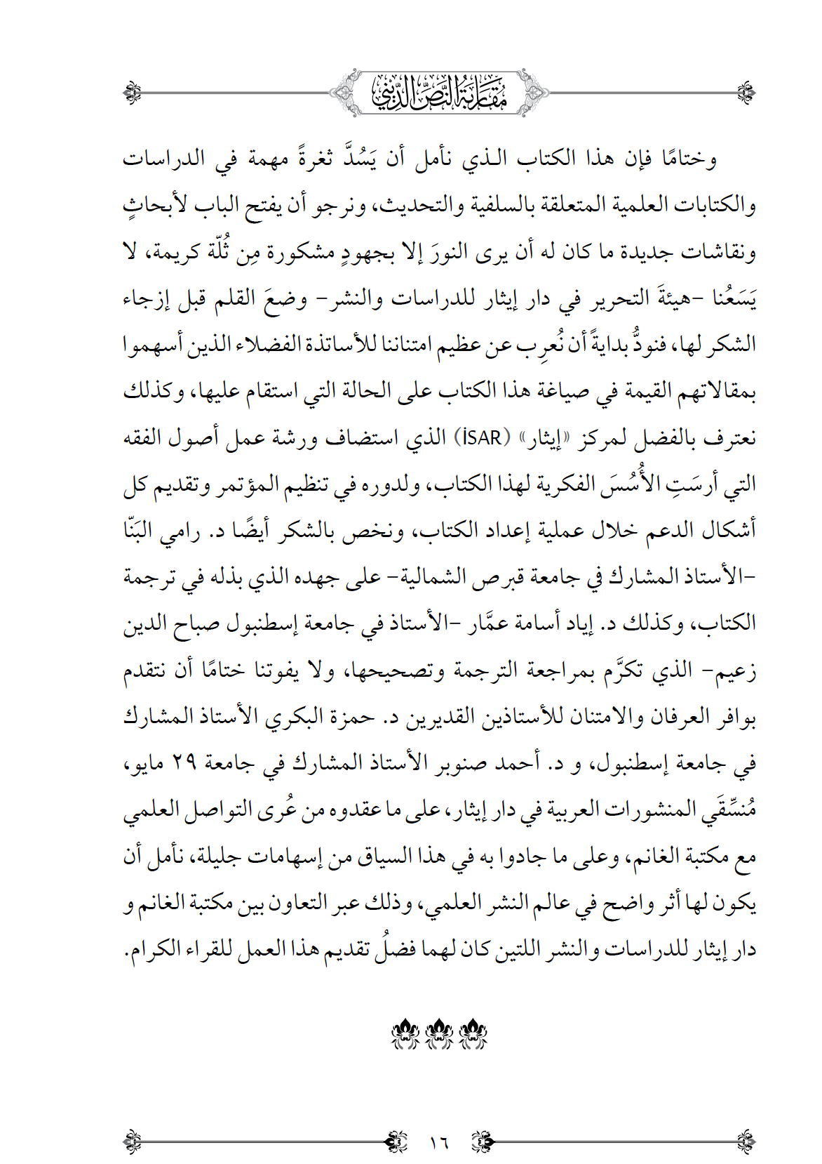 Bu eser, İslam düşüncesinin iki yakası (Arapça-Türkçe) arasında kültürel bir diyaloğu tesis etmeyi amaçlayan umut vadeden ilmî bir katkı niteliğindedir. Zira içinde bulunduğumuz çağ, kopuştan ziyade bütünleşmeye; yüzeysellikten ziyade derinliğe her zamankinden daha fazla ihtiyaç duymaktadır.